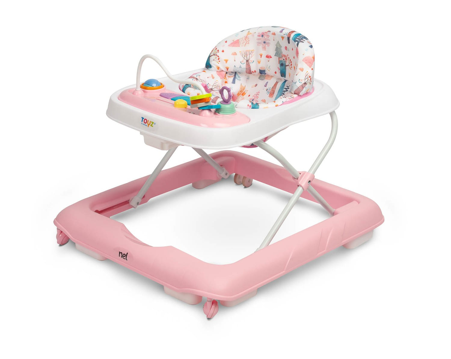 Nel to przystępny cenowo i stylowy chodzik dla maluchów marki Toyz.  Wyróżnia go elegancka kolorystyka i wygoda użytkowania. Specjalna konstrukcja umożliwia dopasowanie położenia siedziska do wysokości malucha – tak, by stópki swobodnie dotykały podłoża. Wyposażony jest w dźwiękowy panel zasilany bateriami i manualne zabawki, które zapewniają dobrą zabawę.
