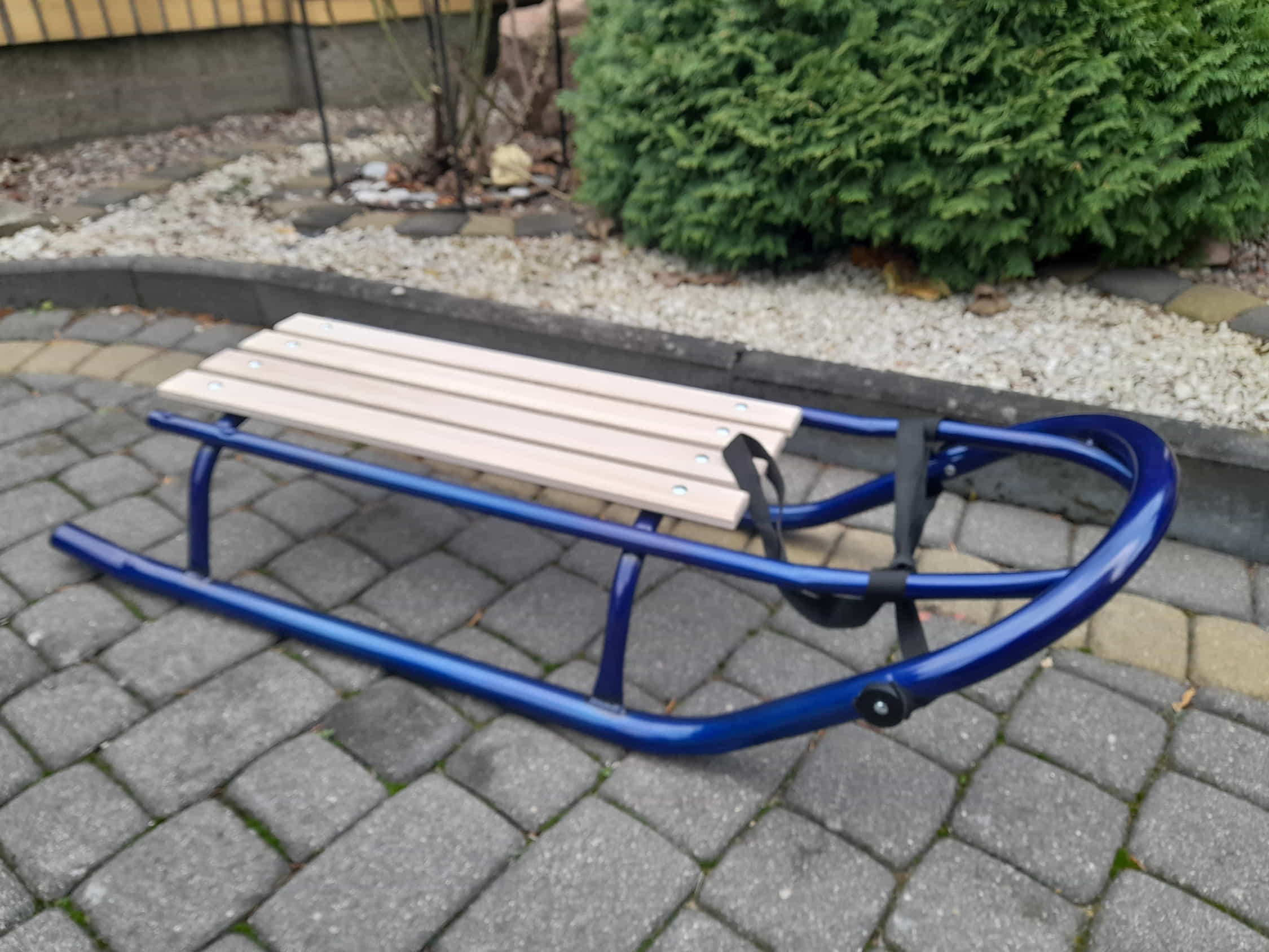 Sanki są metalowe z drewnianym siedziskiem bukowym.