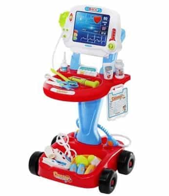 - WÓZEK + 18 ELEMENTÓW – ilość części pozwala na praktyczne wykorzystanie zestawu; 18 przyrządów lekarskich oraz 2-poziomowy wózek z imitacją ekranu EKG i uchwytem umożliwiają urozmaiconą, kreatywną i wielokrotna zabawę.